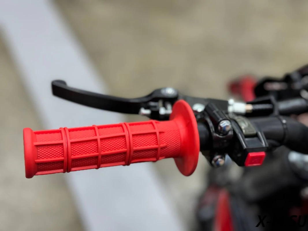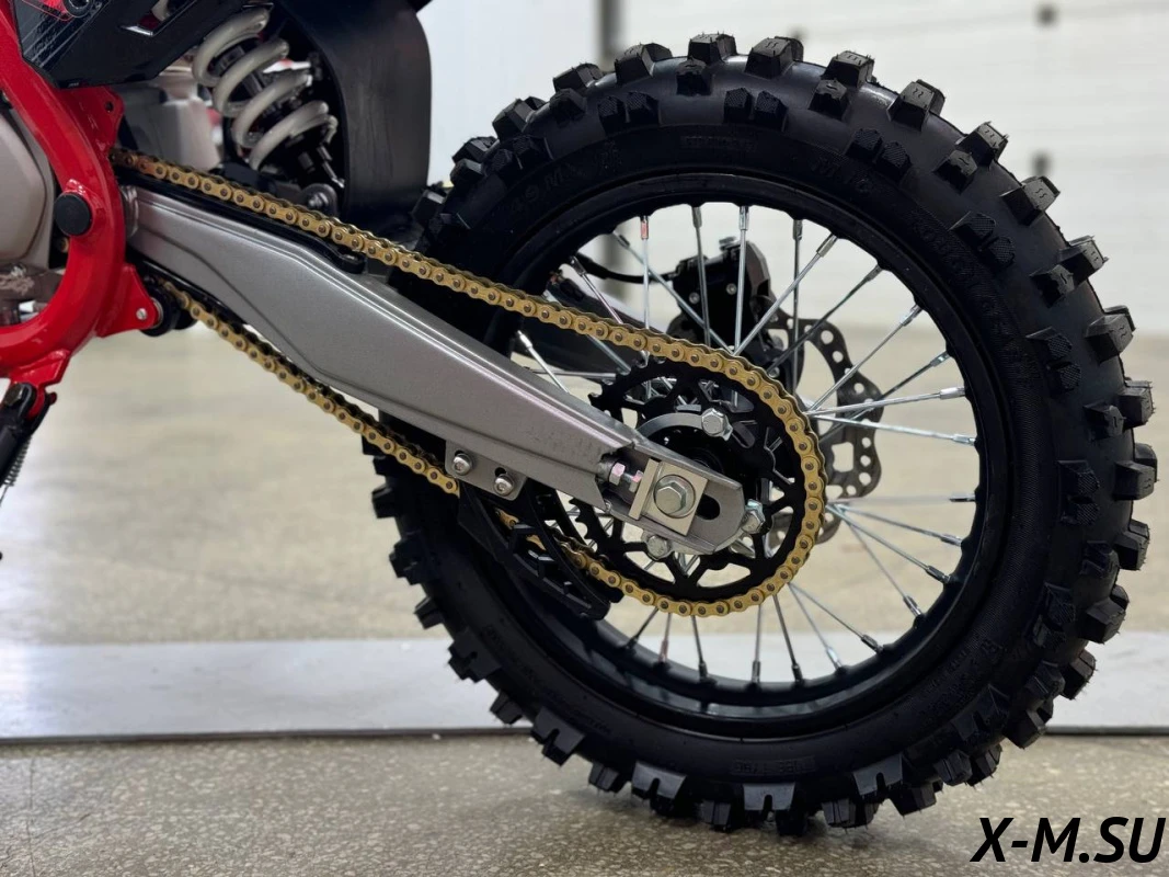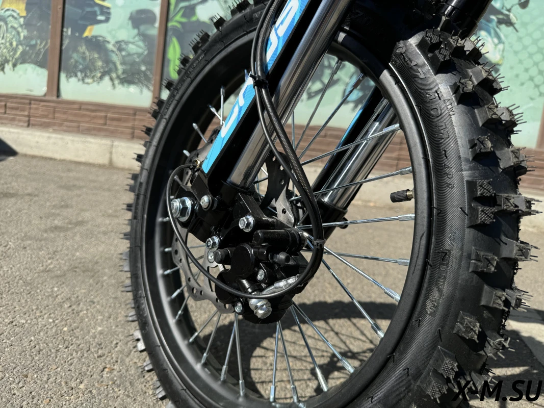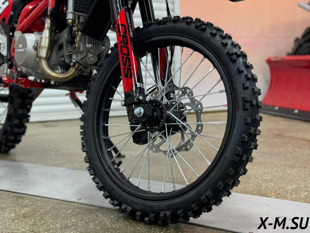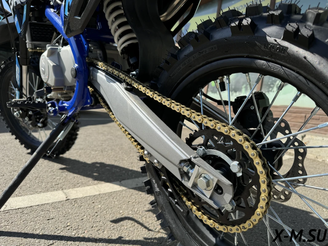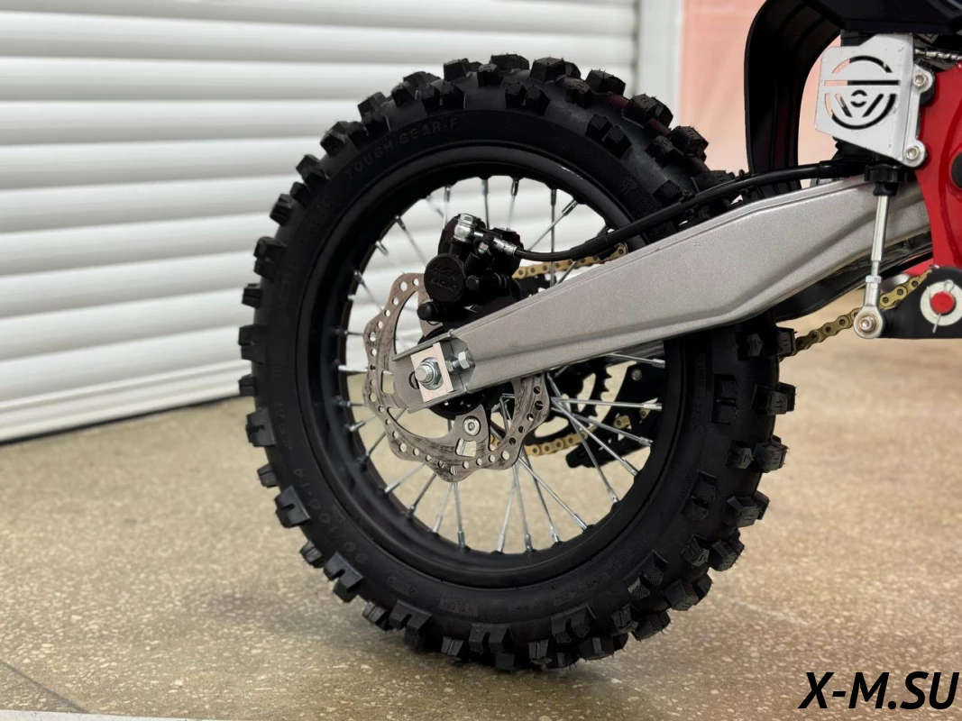 Удлиненная колесная база 1220 мм увеличивает устойчивость питбайка и позволяет гонщику комфортно держаться даже на раскисших от дождя дорогах. Диаметр колёс составляет 17/14 дюймов.