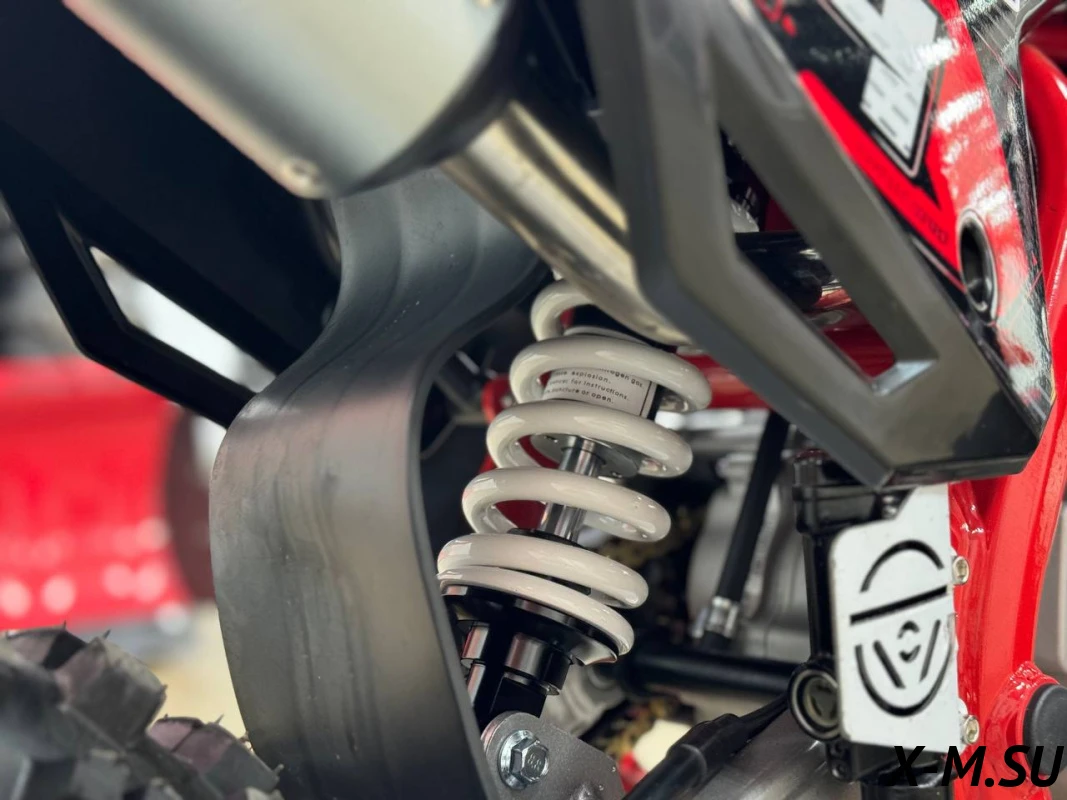 Задняя подвеска (диаметр штока 12 мм) с регулировкой преднатяга пружины помогает питбайку не вилять на поворотах и стабильно проходить все сложные участки трассы. Стальной маятник изготовлен из надёжного хромомолибденового сплава.
